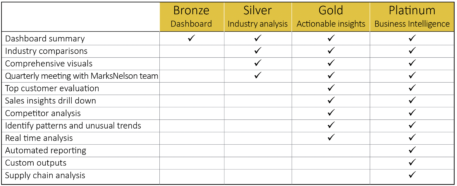 Gold: (Quarterly) Benefits of Silver plus review and analysis of data using modern business intelligence. Competitor analysis, top customer evaluation, sales insights, patterns and trends are integrated into a powerful visual tool.